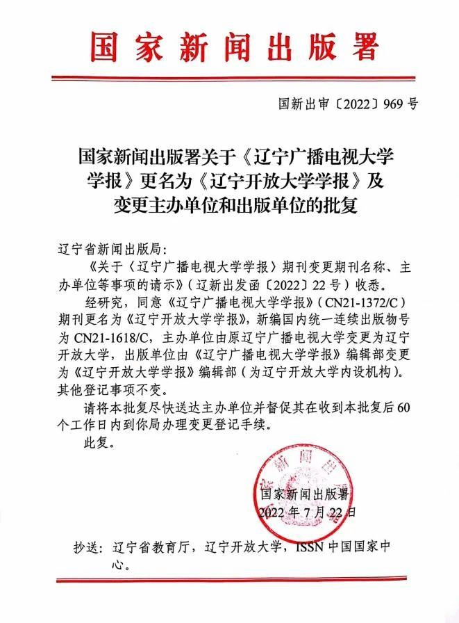 2022年7月22日,國家新聞出版署作出《關于〈遼寧廣播電視大學學報〉更名為〈遼寧開放大學學報〉及變更主辦單位和出版單位的批復》(國新出審〔2022〕969號),同意《遼寧廣播電視大學學報》更名為《遼寧開放大學學報》。更名后,學報國內(nèi)統(tǒng)一刊號變更為CN21-1618/C,國際標準刊號變更為ISSN2097-2040;主辦單位變更為遼寧開放大學,出版單位變更為《遼寧開放大學學報》編輯部(為遼寧開放大學內(nèi)設機構(gòu))。