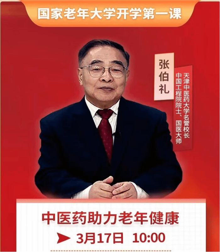 2023年3月17日上午10:00,國家老年大學特邀天津中醫(yī)藥大學名譽校長、中國工程院院士、國醫(yī)大師張伯禮先生講授“國家老年大學開學第一課:中醫(yī)藥助力老年健康”,從日常的起居作息、飲食、運動等方面介紹中醫(yī)養(yǎng)生的原則和方法,并以冠心病、高血壓、腦卒中等老年常見病為例,講解老年人心腦血管疾病的防治方法。