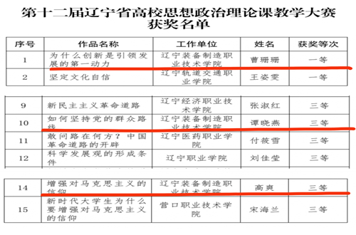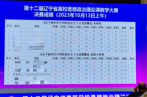 2023年10月13日,第十二屆遼寧省高校思想政治理論課教學(xué)大賽決賽于沈陽遼寧大廈圓滿收官。本次大賽共有來自全省85所高校的364名選手參賽,經(jīng)過激烈角逐,我校教師曹珊珊在“習(xí)近平新時(shí)代中國特色社會主義思想概論”課程比賽中,以高職組第一名的成績獲得一等獎(jiǎng),譚曉燕、高爽老師分別獲得“毛澤東思想和中國特色社會主義理論體系概論”和“思想道德與法治”課程組三等獎(jiǎng),充分展示了我校思政課教師良好的精神風(fēng)貌和扎實(shí)的專業(yè)功底。