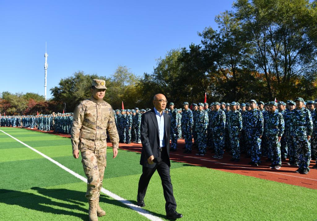 在莊嚴(yán)的國(guó)歌聲中,軍訓(xùn)閉營(yíng)儀式正式開始。任慶國(guó)在駐訓(xùn)部隊(duì)政治指導(dǎo)員夏偉的陪同下檢閱受訓(xùn)方隊(duì)。