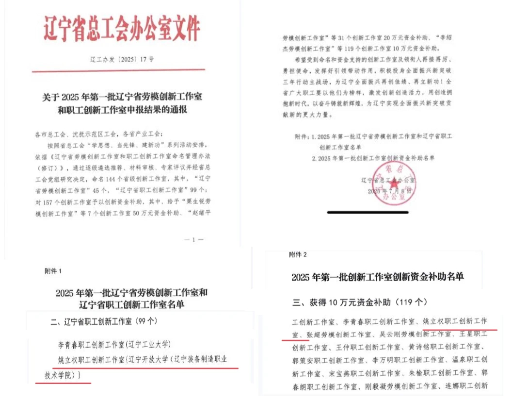 此次共命名 144 個省級創(chuàng)新工作室(其中 “遼寧省職工創(chuàng)新工作室” 99 個),并對 157 個創(chuàng)新工作室予以創(chuàng)新資金補助。姚立權職工創(chuàng)新工作室憑借扎實的創(chuàng)新實踐、突出的成果成效及較強的示范引領作用,成功入選并獲得資金支持。