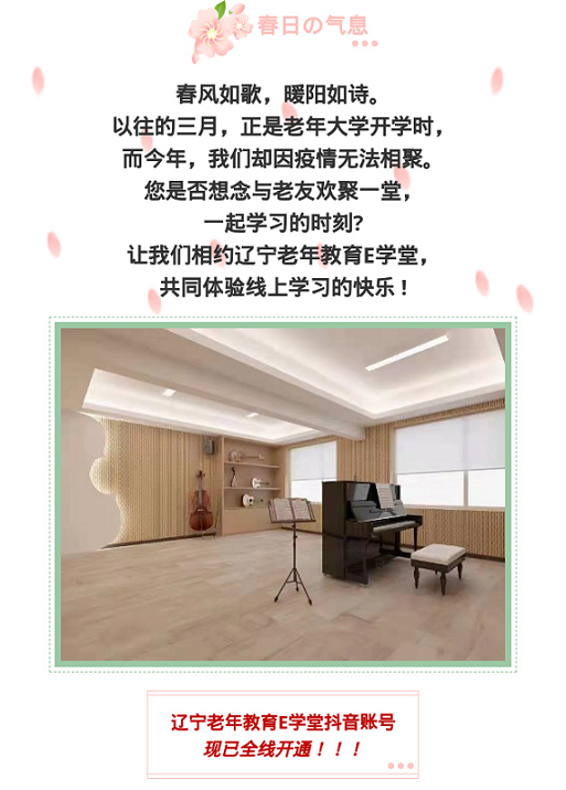 春風(fēng)如歌,暖陽如詩。陽春三月,正是昔時(shí)老年大學(xué)開學(xué)季,然而壬寅仲春,卻因“新冠”病毒的再度肆虐,各地老年大學(xué)延遲開學(xué),學(xué)員居家防疫。為確保疫情期間“停課不停學(xué)”,滿足廣大老年人求學(xué)求知愿望,遼寧開放大學(xué)開通“老年教育E學(xué)堂”官方抖音賬號(hào),面向全省老年人免費(fèi)提供在線課程學(xué)習(xí)及服務(wù)。