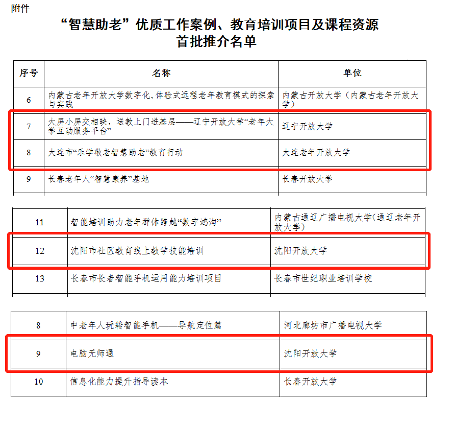 根據(jù)教育部《關(guān)于組織開展“智慧助老”優(yōu)質(zhì)工作案例、教育培訓(xùn)項(xiàng)目及課程資源推介工作的通知》(教職成司函〔2021〕44號(hào))要求,在省教育廳的領(lǐng)導(dǎo)下,經(jīng)各單位推薦、省社區(qū)教育指導(dǎo)中心審核推薦,遼寧開放大學(xué)的“大屏小屏交相映,送教上門進(jìn)基層——遼寧開放大學(xué)‘老年大學(xué)互動(dòng)服務(wù)平臺(tái)’”、大連老年開放大學(xué)的“大連市‘樂學(xué)敬老智慧助老’教育行動(dòng)”入選首批優(yōu)質(zhì)工作案例,沈陽開放大學(xué)的“沈陽市社區(qū)教育線上教學(xué)技能培訓(xùn)”和“電腦無師通”分別入選首批優(yōu)質(zhì)教育培訓(xùn)項(xiàng)目和優(yōu)質(zhì)課程資源。