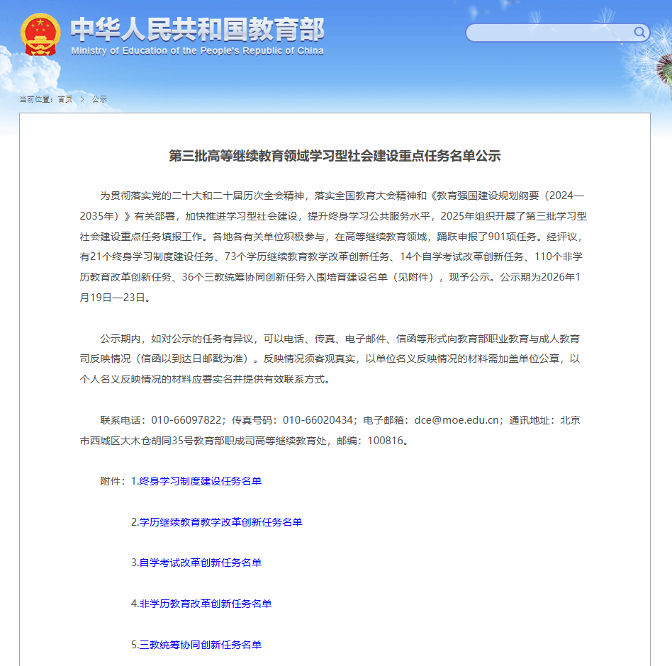 高等繼續(xù)教育領(lǐng)域?qū)W習(xí)型社會建設(shè)重點任務(wù)是教育部貫徹落實黨的二十大及全國教育大會精神、實施《教育強國建設(shè)規(guī)劃綱要(2024—2035年)》的重要舉措,旨在遴選理念領(lǐng)先、特色鮮明、成效突出的示范項目,引領(lǐng)全國高等繼續(xù)教育改革創(chuàng)新,助力全民終身學(xué)習(xí)體系構(gòu)建。本批次遴選共收到全國各類單位申報項目901項,經(jīng)專家多輪嚴(yán)格評審,最終254個項目成功入圍。